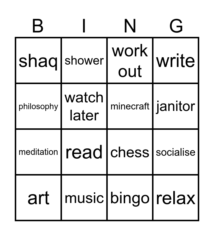 This bingo card has 16 words: music, socialise, work out, shaq, meditation, shower, chess, bingo, philosophy, watch later, art, write, read, janitor, minecraft and relax.