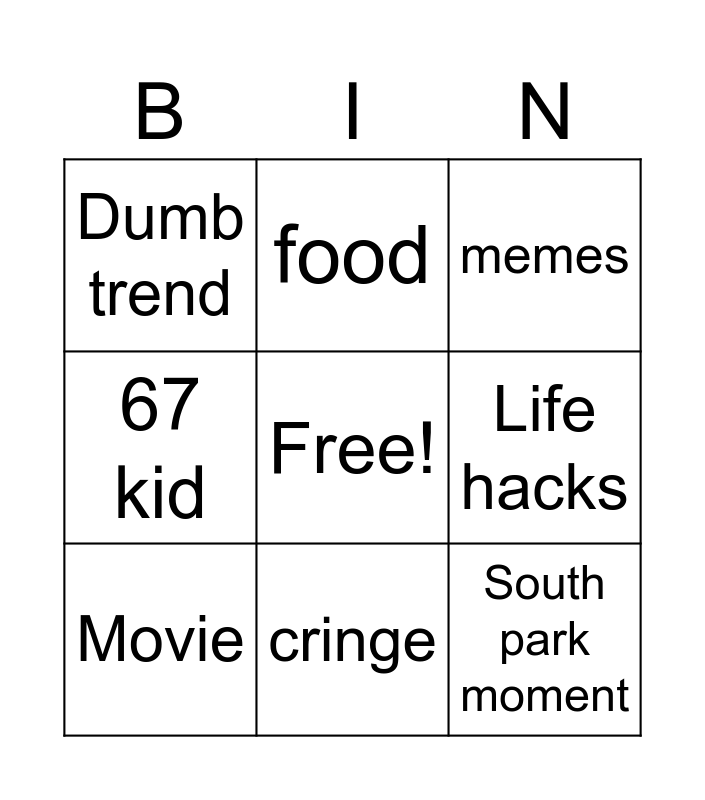 This bingo card has a free space and 8 words: 67 kid, food, Life hacks, Movie, memes, Dumb trend, cringe and South park moment.