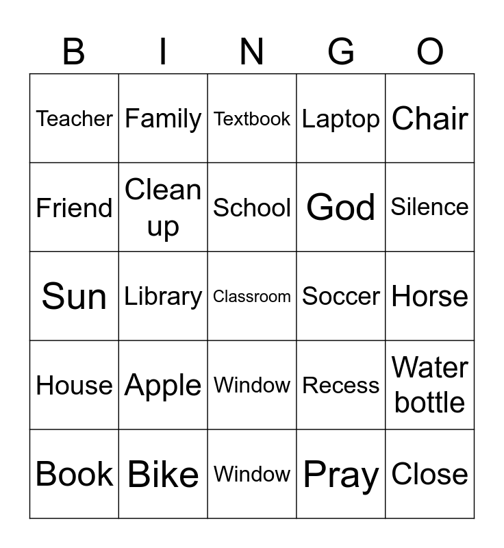 This bingo card has 25 words: Apple, Window, School, Book, Chair, Teacher, Friend, Family, Soccer, Window, God, Sun, Recess, Water bottle, Clean up, Close, Horse, Textbook, Silence, Library, Classroom, Bike, House, Laptop and Pray.