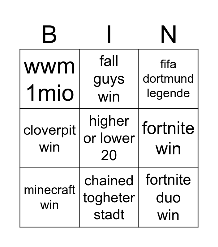 This bingo card has a free space and 8 words: fortnite win, fifa dortmund legende, fall guys win, minecraft win, wwm 1mio, fortnite duo win, cloverpit win and chained togheter stadt.