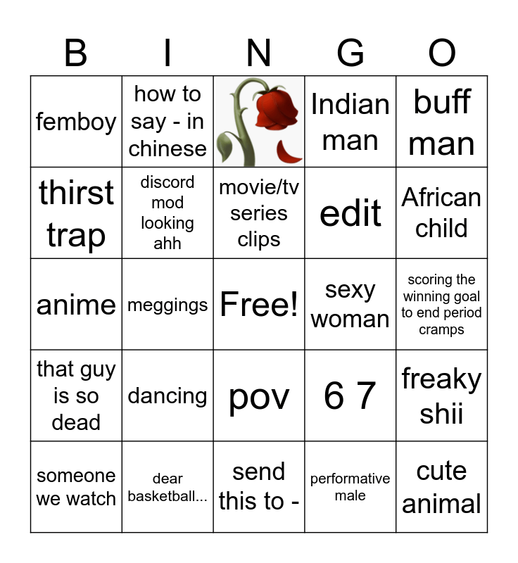 This bingo card has 1 images, a free space and 23 words: dancing, dear basketball..., movie/tv series clips, someone we watch, buff man, femboy, thirst trap, how to say - in chinese, sexy woman, pov, edit, anime, 6 7, freaky shii, discord mod looking ahh, performative male, scoring the winning goal to end period cramps, African child, meggings, cute animal, that guy is so dead, Indian man and send this to -.