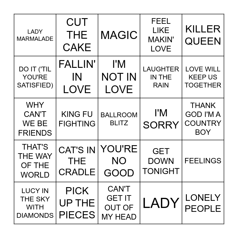 This bingo card has 51 words: (HEY WON'T YOU PLAY) ANOTHER SOMEBODY DONE SOMEBODY WRONG SONG, BALLROOM BLITZ, BLACK WATER, CAN'T GET IT OUT OF MY HEAD, CAT'S IN THE CRADLE, COULD IT BE MAGIC, CUT THE CAKE, DANCE WITH ME, DO IT ('TIL YOU'RE SATISFIED), DYNOMITE, FALLIN' IN LOVE, FEEL LIKE MAKIN' LOVE, FEELINGS, GET DOWN TONIGHT, HOW LONG, HOW SWEET IT IS (TO BE LOVED BY YOU), I'M NOT IN LOVE, I'M SORRY, JIVE TALKIN', KILLER QUEEN, KING FU FIGHTING, LADY, LADY MARMALADE, LAUGHTER IN THE RAIN, LISTEN TO WHAT THE MAN SAID, LONELY PEOPLE, LOVE WILL KEEP US TOGETHER, LOVIN' YOU, LUCY IN THE SKY WITH DIAMONDS, MAGIC, MANDY, MY EYES ADORED YOU, ONE OF THESE NIGHTS, ONLY YESTERDAY, PHILADELPHIA FREEDOM, PICK UP THE PIECES, SHINING STAR, SISTER GOLDEN HAIR, SOME KIND OF WONDERFUL, SOMEONE SAVED MY LIFE TONIGHT, THANK GOD I'M A COUNTRY BOY, THAT'S THE WAY OF THE WORLD, THE BEST OF MY LOVE, THE HUSTLE, THEME FROM THE ROCKFORD FILES, WHEN WILL I SEE YOU AGAIN, WHY CAN'T WE BE FRIENDS, YOU AIN'T SEEN NOTHING YET, YOU ARE SO BEAUTIFUL, YOU'RE NO GOOD and YOU'RE THE FIRST, THE LAST, MY EVERYTHING.