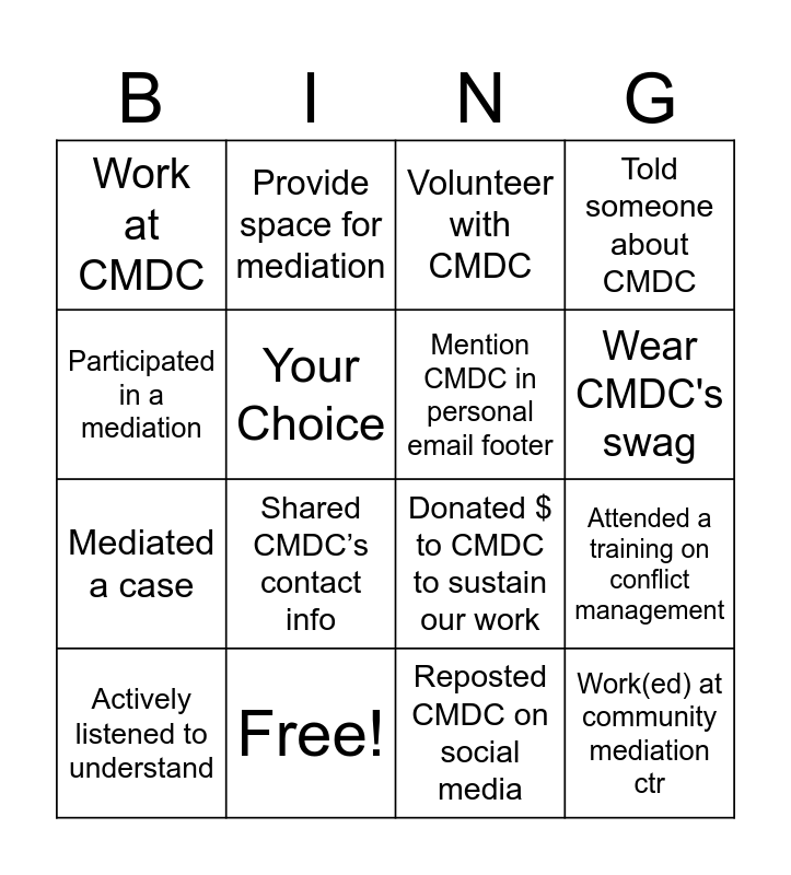 This bingo card has 16 words: Free!, Attended a training on conflict management, Volunteer with CMDC, Work at CMDC, Mediated a case, Provide space for mediation, Donated $ to CMDC to sustain our work, Reposted CMDC on social media, Participated in a mediation, Your Choice, Actively listened to understand, Told someone about CMDC, Shared CMDC’s contact info, Wear CMDC's swag, Mention CMDC in personal email footer and Work(ed) at community mediation ctr.