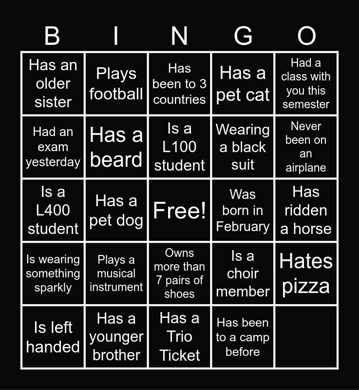This bingo card has a free space and 24 words: Is wearing something sparkly, Has a younger brother, Owns more than 7 pairs of shoes, Is a choir member, Had a class with you this semester, Has an older sister, Plays football, Has been to 3 countries, Wearing a black suit, Hates pizza, Had an exam yesterday, Has a beard, Is an only child, Was born in February, Never been on an airplane, Is left handed, Has a pet dog, Is a L100 student, Has a pet cat, Has ridden a horse, Is a L400 student, Plays a musical instrument, Has a Trio Ticket and Has been to a camp before.