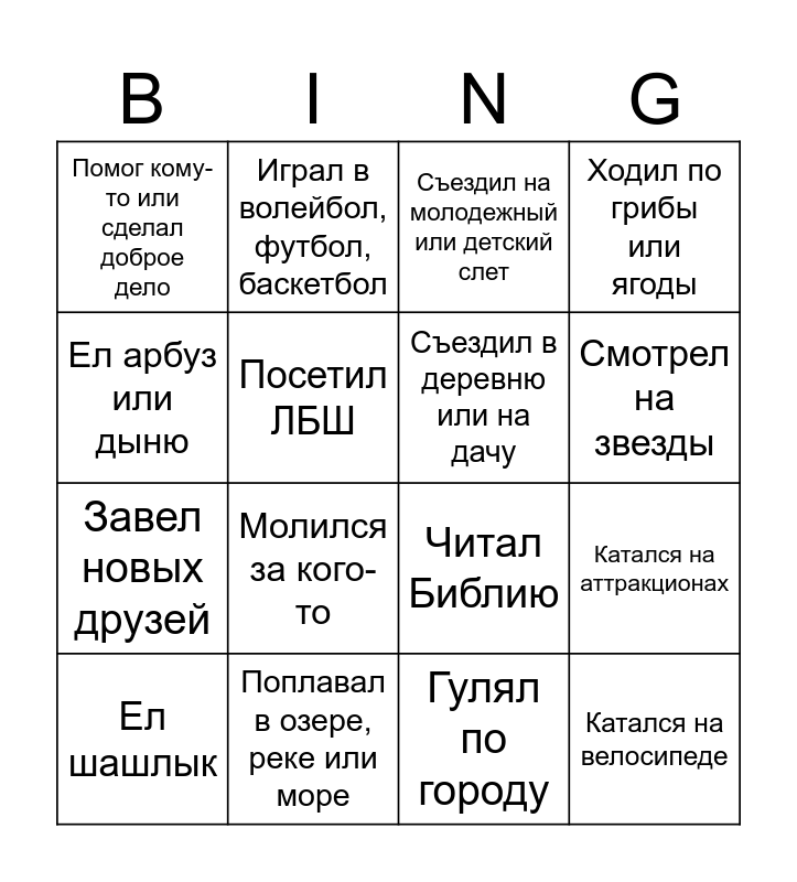 This bingo card has 16 words: Поплавал в озере, реке или море, Катался на аттракционах, Съездил на молодежный или детский слет, Помог кому-то или сделал доброе дело, Завел новых друзей, Играл в волейбол, футбол, баскетбол, Читал Библию, Гулял по городу, Ел арбуз или дыню, Посетил ЛБШ, Ел шашлык, Ходил по грибы или ягоды, Молился за кого-то, Смотрел на звезды, Съездил в деревню или на дачу and Катался на велосипеде.