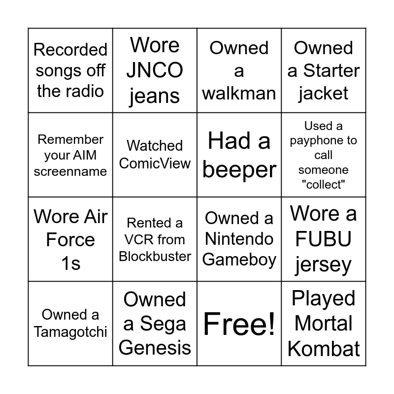 This bingo card has 17 words: Free!, Owned a Tamagotchi, Owned a walkman, Recorded songs off the radio, Rented a VCR from Blockbuster, Owned a Starter jacket, Wore a FUBU jersey, Had a beeper, Used a payphone to call someone "collect", Watched ComicView, Owned a Sega Genesis, Owned a Nintendo Gameboy, Remember your AIM screenname, Wore JNCO jeans, Wore Air Force 1s, Can do the Running Man and Played Mortal Kombat.