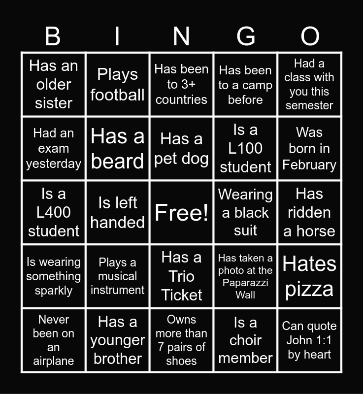 This bingo card has a free space and 25 words: Is wearing something sparkly, Has a younger brother, Owns more than 7 pairs of shoes, Is a choir member, Had a class with you this semester, Has an older sister, Plays football, Has been to 3+ countries, Wearing a black suit, Hates pizza, Had an exam yesterday, Has a beard, Is an only child, Has taken a photo at the Paparazzi Wall, Was born in February, Never been on an airplane, Is left handed, Has a pet dog, Is a L100 student, Has ridden a horse, Is a L400 student, Plays a musical instrument, Has a Trio Ticket, Has been to a camp before and Can quote John 1:1 by heart.