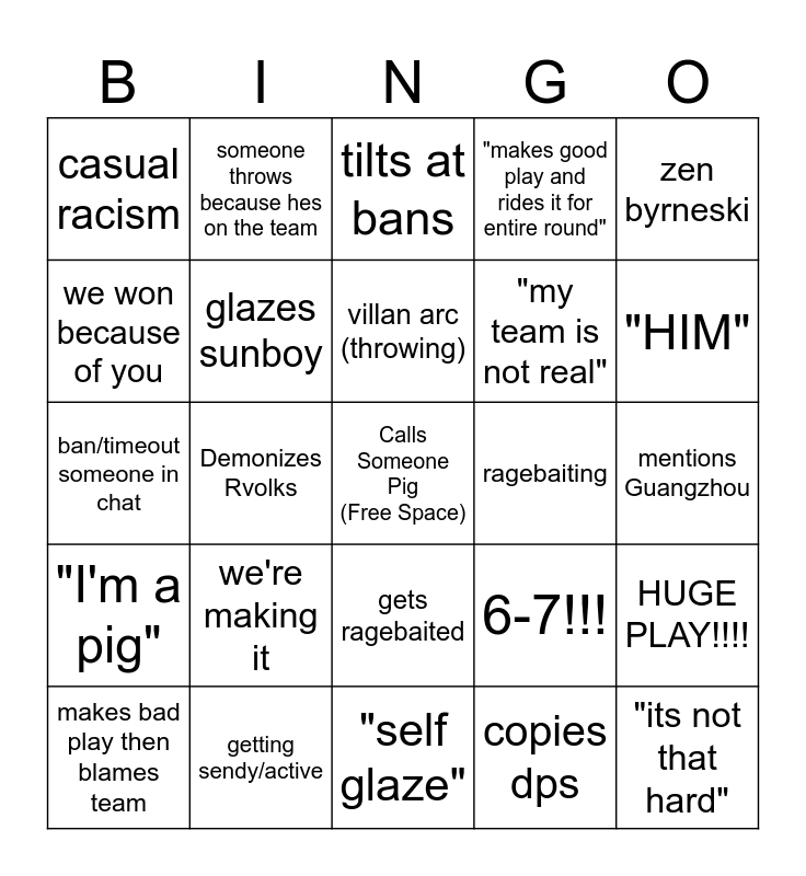 This bingo card has a free space and 24 words: we're making it, getting sendy/active, villan arc (throwing), makes bad play then blames team, zen byrneski, casual racism, we won because of you, someone throws because hes on the team, ragebaiting, gets ragebaited, "my team is not real", ban/timeout someone in chat, 6-7!!!, HUGE PLAY!!!!, glazes sunboy, copies dps, mentions Guangzhou, tilts at bans, "HIM", Demonizes Rvolks, "its not that hard", "I'm a pig", "makes good play and rides it for entire round" and "self glaze".