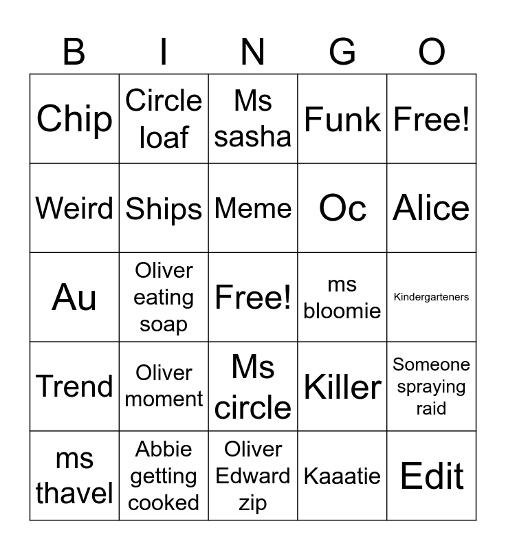 This bingo card has a free space and 24 words: Oliver moment, Abbie getting cooked, Meme, ms thavel, Free!, Chip, Weird, Circle loaf, ms bloomie, Ms circle, Oc, Au, Killer, Someone spraying raid, Ships, Kaaatie, Kindergarteners, Ms sasha, Alice, Oliver eating soap, Edit, Trend, Funk and Oliver Edward zip.