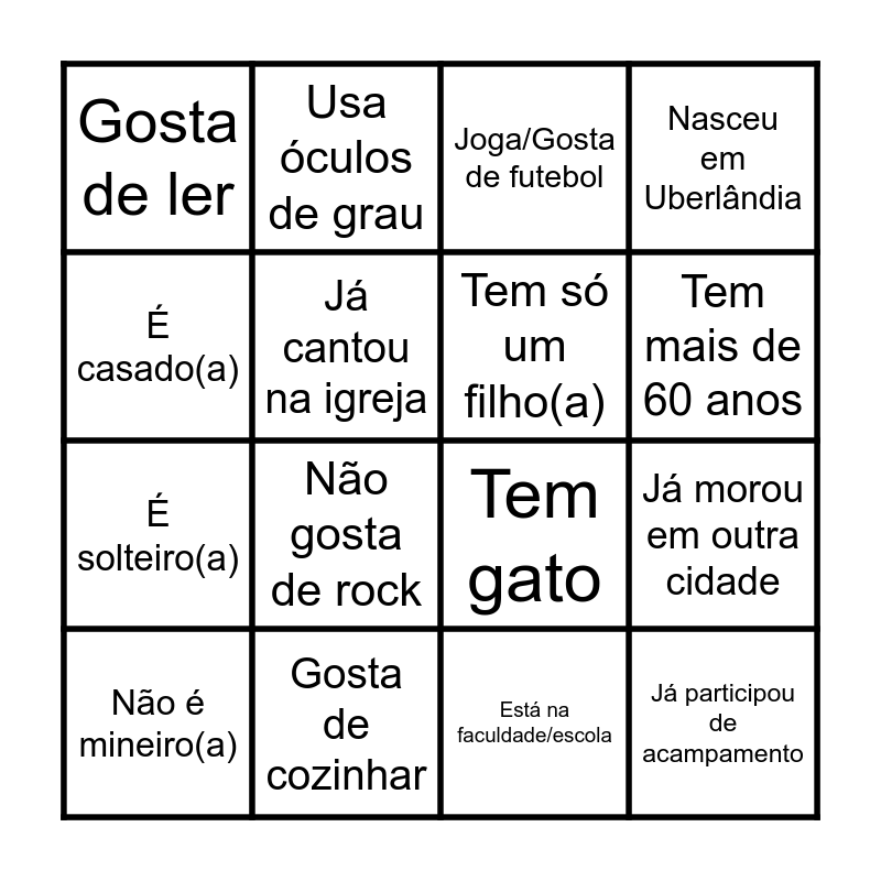This bingo card has 38 words: Faz aniversário no mesmo dia que eu, Tem mais de um irmão(ã), É filho(a) único(a), Tem só um filho(a), Tem mais de um filho(a), Tem neto(a), Tem mais de 60 anos, Tem menos de 12 anos, É casado(a), É solteiro(a), Já morou em outra cidade, Nasceu em Uberlândia, Não é mineiro(a), Está na faculdade/escola, Já cantou na igreja, Já participou de acampamento, Toca algum instrumento, Joga/Gosta de futebol, Não gosta de café, Gosta de cozinhar, Gosta de ler, Gosta de música sertaneja, Não gosta de rock, Está de camisa verde, Está de tênis, Está de sandália, Tem barba, Já pintou o cabelo, Prefere doce do que salgado, Prefere salgado do que doce, É da área da saúde (estuda ou trabalha), É da área de tecnologia (estuda ou trabalha), É da área da educação (estuda ou trabalha), Usa óculos de grau, Não usa óculos de grau, Tem cachorro, Tem gato and Joga Vôlei.