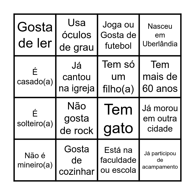 This bingo card has 38 words: Faz aniversário no mesmo dia que eu, Tem mais de um irmão(ã), É filho(a) único(a), Tem só um filho(a), Tem mais de um filho(a), Tem neto(a), Tem mais de 60 anos, Tem menos de 12 anos, É casado(a), É solteiro(a), Já morou em outra cidade, Nasceu em Uberlândia, Não é mineiro(a), Está na faculdade ou escola, Já cantou na igreja, Já participou de acampamento, Toca algum instrumento, Joga ou Gosta de futebol, Não gosta de café, Gosta de cozinhar, Gosta de ler, Gosta de música sertaneja, Não gosta de rock, Está de camisa verde, Está de tênis, Está de sandália, Tem barba, Já pintou o cabelo, Prefere doce do que salgado, Prefere salgado do que doce, É da área da saúde (estuda ou trabalha), É da área de tecnologia (estuda ou trabalha), É da área da educação (estuda ou trabalha), Usa óculos de grau, Não usa óculos de grau, Tem cachorro, Tem gato and Joga vôlei.