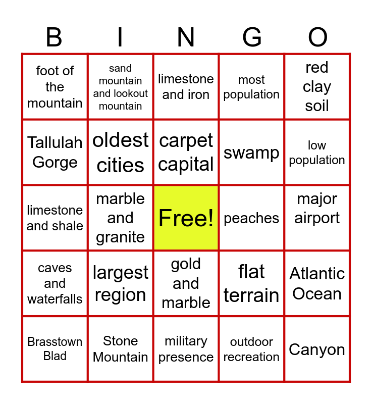 This bingo card has a free space and 24 words: largest region, Stone Mountain, carpet capital, Brasstown Blad, red clay soil, foot of the mountain, Tallulah Gorge, sand mountain and lookout mountain, peaches, gold and marble, swamp, limestone and shale, flat terrain, Atlantic Ocean, oldest cities, outdoor recreation, major airport, limestone and iron, low population, marble and granite, Canyon, caves and waterfalls, most population and military presence.