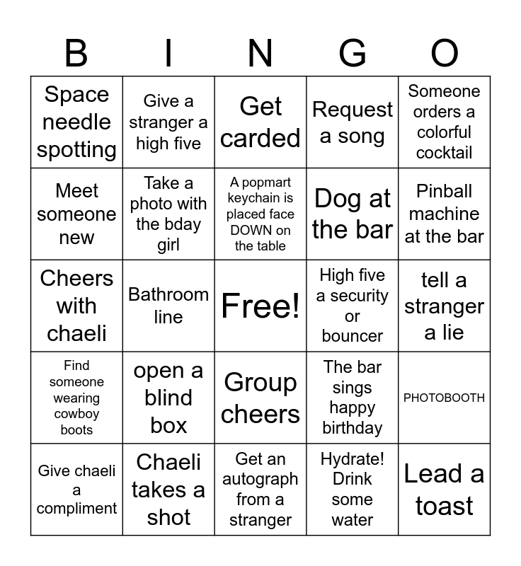 This bingo card has a free space and 24 words: open a blind box, Chaeli takes a shot, A popmart keychain is placed face DOWN on the table, Give chaeli a compliment, Someone orders a colorful cocktail, Space needle spotting, Meet someone new, Give a stranger a high five, High five a security or bouncer, Group cheers, Dog at the bar, Cheers with chaeli, The bar sings happy birthday, PHOTOBOOTH, Take a photo with the bday girl, Hydrate! Drink some water, tell a stranger a lie, Get carded, Pinball machine at the bar, Bathroom line, Lead a toast, Find someone wearing cowboy boots, Request a song and Get an autograph from a stranger.