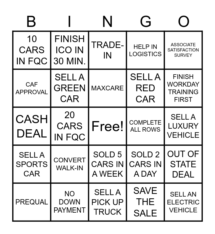 This bingo card has a free space and 24 words: PREQUAL, CONVERT WALK-IN, MAXCARE, SAVE THE SALE, ASSOCIATE SATISFACTION SURVEY, 10 CARS IN FQC, FINISH ICO IN 30 MIN., TRADE-IN, COMPLETE ALL ROWS, SELL A LUXURY VEHICLE, CASH DEAL, SELL A GREEN CAR, SOLD 2 CARS IN A DAY, OUT OF STATE DEAL, CAF APPROVAL, NO DOWN PAYMENT, SELL A PICK UP TRUCK, HELP IN LOGISTICS, FINISH WORKDAY TRAINING FIRST, SELL A SPORTS CAR, 20 CARS IN FQC, SOLD 5 CARS IN A WEEK, SELL A RED CAR and SELL AN ELECTRIC VEHICLE.