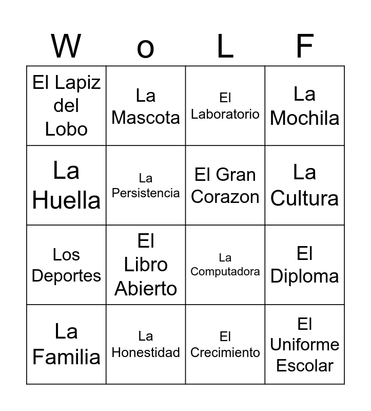 This bingo card has 24 words: El Lobo, El Escuela, La Cultura, La Luna, La Huella, El Lapiz del Lobo, La Persistencia, La Mascota, La Honestidad, El Maestro, Los Deportes, La Computadora, La Alegria, El Futuro, El Gran Corazon, El Companero, El Crecimiento, El Laboratorio, El Libro Abierto, El Diploma, La Familia, El Uniforme Escolar, La Mochila and La Graduacion.