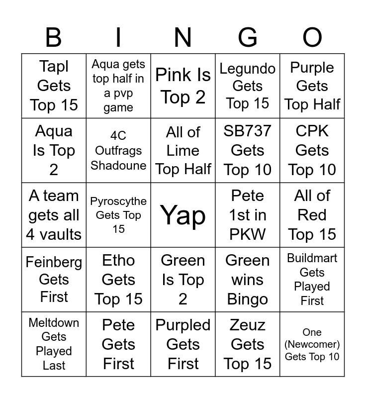 This bingo card has a free space and 24 words: Etho Gets Top 15, Pete Gets First, All of Lime Top Half, Meltdown Gets Played Last, Purple Gets Top Half, Tapl Gets Top 15, Aqua Is Top 2, Aqua gets top half in a pvp game, Pete 1st in PKW, Green Is Top 2, SB737 Gets Top 10, A team gets all 4 vaults, Green wins Bingo, Buildmart Gets Played First, 4C Outfrags Shadoune, Zeuz Gets Top 15, All of Red Top 15, Pink Is Top 2, CPK Gets Top 10, Pyroscythe Gets Top 15, One (Newcomer) Gets Top 10, Feinberg Gets First, Legundo Gets Top 15 and Purpled Gets First.