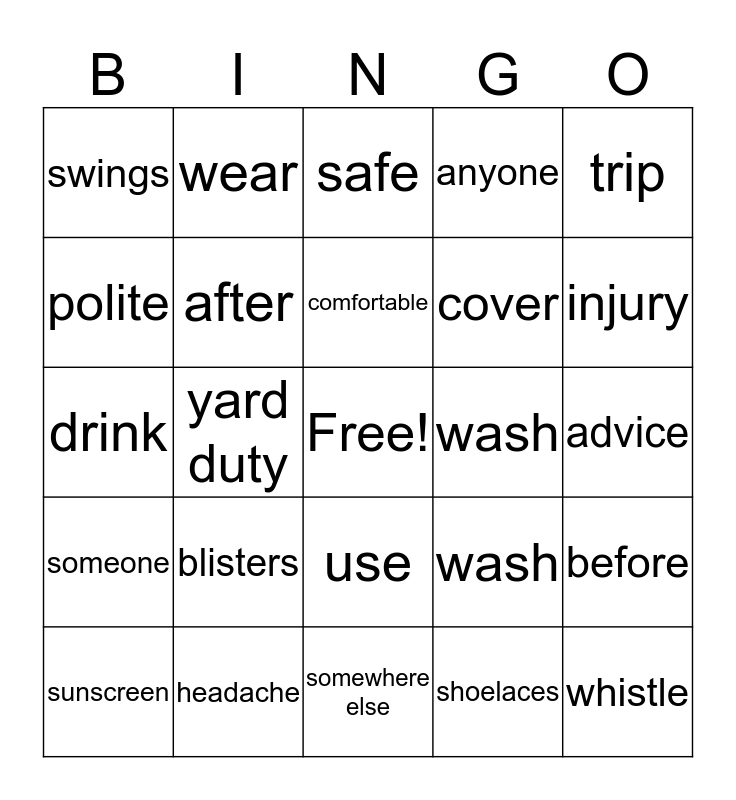 This bingo card has a free space and 24 words: blisters, headache, comfortable, sunscreen, trip, swings, polite, wear, wash, use, cover, drink, wash, before, after, shoelaces, advice, safe, injury, yard duty, whistle, someone, anyone and somewhere else.