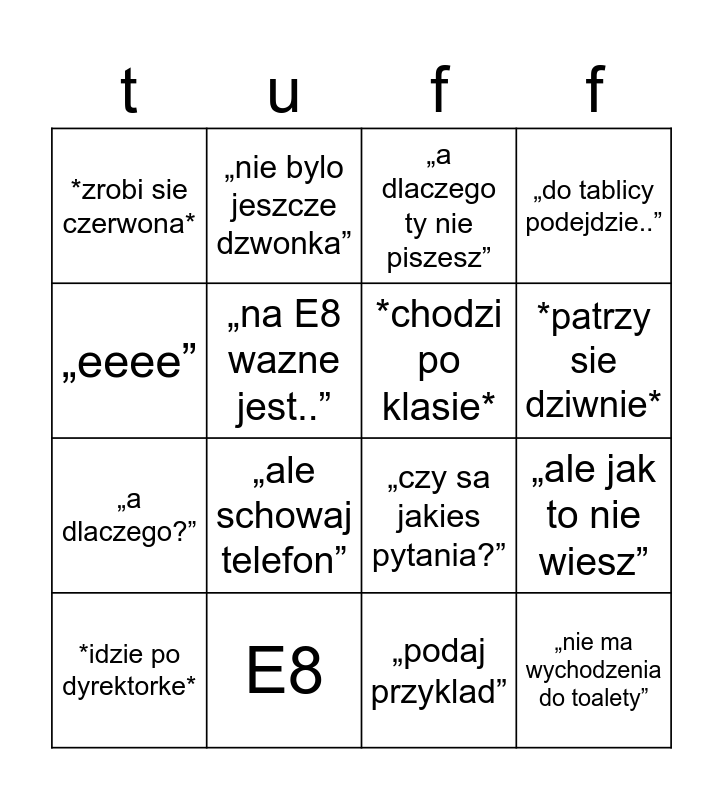This bingo card has 16 words: E8, „ale jak to nie wiesz”, „a dlaczego ty nie piszesz”, *zrobi sie czerwona*, „a dlaczego?”, „nie bylo jeszcze dzwonka”, „czy sa jakies pytania?”, „podaj przyklad”, „eeee”, „na E8 wazne jest..”, *idzie po dyrektorke*, „do tablicy podejdzie..”, „ale schowaj telefon”, *patrzy sie dziwnie*, *chodzi po klasie* and „nie ma wychodzenia do toalety”.
