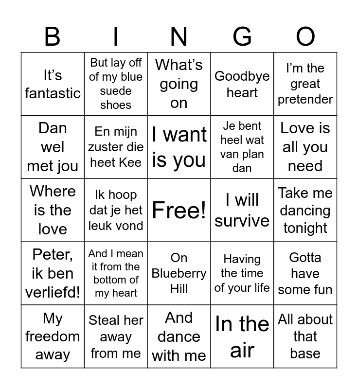 This bingo card has a free space and 46 words: Ahoeoeoe, Wee-oh aweem away, All about that base, All over this land, And dance with me, And I mean it from the bottom of my heart, Around the world, But lay off of my blue suede shoes, Cause when we kiss, oh… fire, Dan wel met jou, Do I pray, En mijn zuster die heet Kee, Goodbye heart, Gotta have some fun, Having the time of your life, I belong, I really need you tonight, I want is you, I will survive, I’m loving angels instead, I’m the great pretender, Ik hoop dat je het leuk vond, In the air, It’s fantastic, Je bent heel wat van plan dan, Living next door to Alice, Love is all you need, My freedom away, Oh yes indeed, On Blueberry Hill, Peter, ik ben verliefd!, Play a song for me, Rolling on a river, She’s gone tomorrow, So I can run away, Somebody to love, Steal her away from me, Take me dancing tonight, That’s the way it is, The world goes round and round, Want Foxie grijpt zijn kansen, Was ich habe auf der Welt, What’s going on, Where is the love, Where we sat down, Yes I love you Peggy Sue and You’re never alone.
