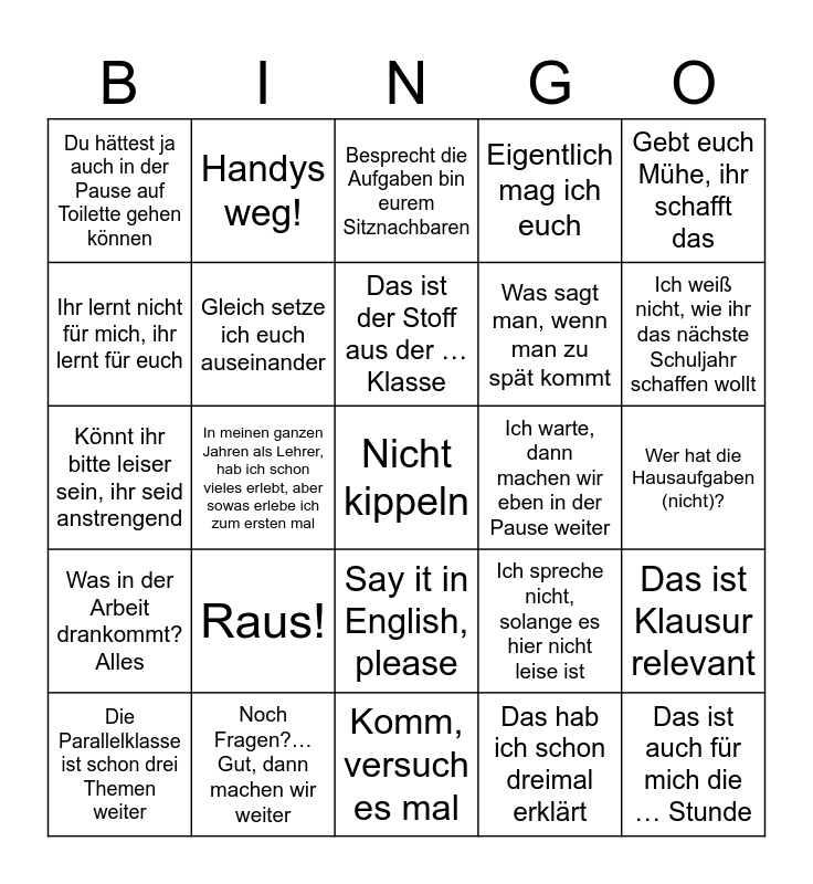 This bingo card has a free space and 24 words: Raus!, Noch Fragen?… Gut, dann machen wir weiter, Das ist der Stoff aus der … Klasse, Die Parallelklasse ist schon drei Themen weiter, Gebt euch Mühe, ihr schafft das, Du hättest ja auch in der Pause auf Toilette gehen können, Ihr lernt nicht für mich, ihr lernt für euch, Handys weg!, Ich warte, dann machen wir eben in der Pause weiter, Say it in English, please, Was sagt man, wenn man zu spät kommt, Könnt ihr bitte leiser sein, ihr seid anstrengend, Ich spreche nicht, solange es hier nicht leise ist, Das ist Klausur relevant, Gleich setze ich euch auseinander, Das hab ich schon dreimal erklärt, Wer hat die Hausaufgaben (nicht)?, Besprecht die Aufgaben bin eurem Sitznachbaren, Ich weiß nicht, wie ihr das nächste Schuljahr schaffen wollt, In meinen ganzen Jahren als Lehrer, hab ich schon vieles erlebt, aber sowas erlebe ich zum ersten mal, Das ist auch für mich die … Stunde, Was in der Arbeit drankommt? Alles, Eigentlich mag ich euch and Komm, versuch es mal.