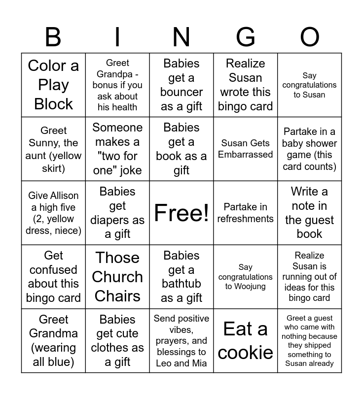 This bingo card has a free space and 24 words: Those Church Chairs, Babies get cute clothes as a gift, Babies get a book as a gift, Greet Grandma (wearing all blue), Say congratulations to Susan, Color a Play Block, Greet Sunny, the aunt (yellow skirt), Greet Grandpa - bonus if you ask about his health, Partake in refreshments, Babies get a bathtub as a gift, Susan Gets Embarrassed, Give Allison a high five (2, yellow dress, niece), Say congratulations to Woojung, Realize Susan is running out of ideas for this bingo card, Someone makes a "two for one" joke, Eat a cookie, Write a note in the guest book, Babies get a bouncer as a gift, Partake in a baby shower game (this card counts), Babies get diapers as a gift, Greet a guest who came with nothing because they shipped something to Susan already, Get confused about this bingo card, Realize Susan wrote this bingo card and Send positive vibes, prayers, and blessings to Leo and Mia.