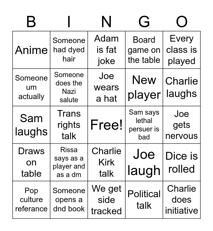 This bingo card has a free space and 24 words: Rissa says as a player and as a dm, Someone opens a dnd book, Joe wears a hat, Pop culture referance, Every class is played, Anime, Someone um actually, Someone had dyed hair, Sam says lethal persuer is bad, Charlie Kirk talk, New player, Sam laughs, Joe laugh, Dice is rolled, Someone does the Nazi salute, Political talk, Joe gets nervous, Adam is fat joke, Charlie laughs, Trans rights talk, Charlie does initiative, Draws on table, Board game on the table and We get side tracked.