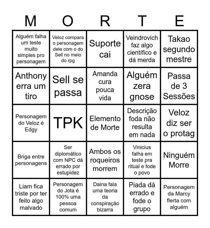 This bingo card has a free space and 24 words: Ser diplomático com NPC dá errado por estupidez, Personagem do Jota é 100% uma pessoa comum, Amanda cura pouca vida, Liam fica triste por ter feito algo malvado, Takao segundo mestre, Alguém falha um teste muito simples pro personagem, Anthony erra um tiro, Veloz compara o personagem dele com o do Sell no meio do rpg, Descrição foda não resulta em nada, Ambos os roqueiros morrem, Alguém zera gnose, Personagem do Veloz é Edgy, Vinicius falha em teste pra ritual e fode o povo, Ninguém Morre, Sell se passa, Piada dá errado e fode o grupo, Veloz diz ser o protag, Suporte cai, Passa de 3 Sessões, TPK, Personagem da Marcy flerta com alguém, Briga entre personagens, Veindrovich faz algo científico e dá merda and Daina fala uma teoria da conspiração bizarra.