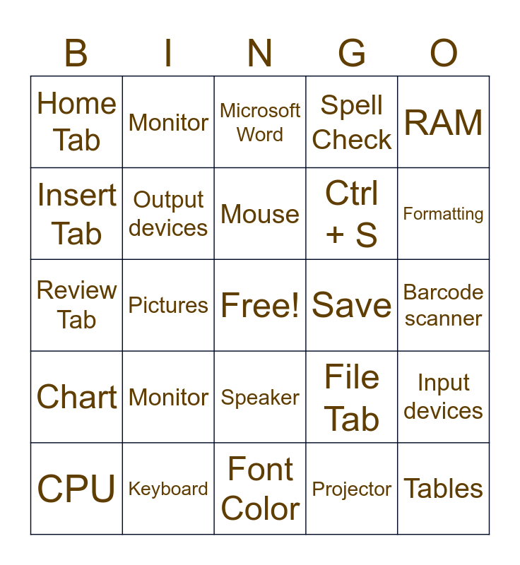 This bingo card has a free space and 24 words: Monitor, Keyboard, Mouse, CPU, RAM, Home Tab, Insert Tab, Monitor, Save, Speaker, Ctrl + S, Review Tab, File Tab, Input devices, Output devices, Projector, Barcode scanner, Microsoft Word, Formatting, Pictures, Tables, Chart, Spell Check and Font Color.