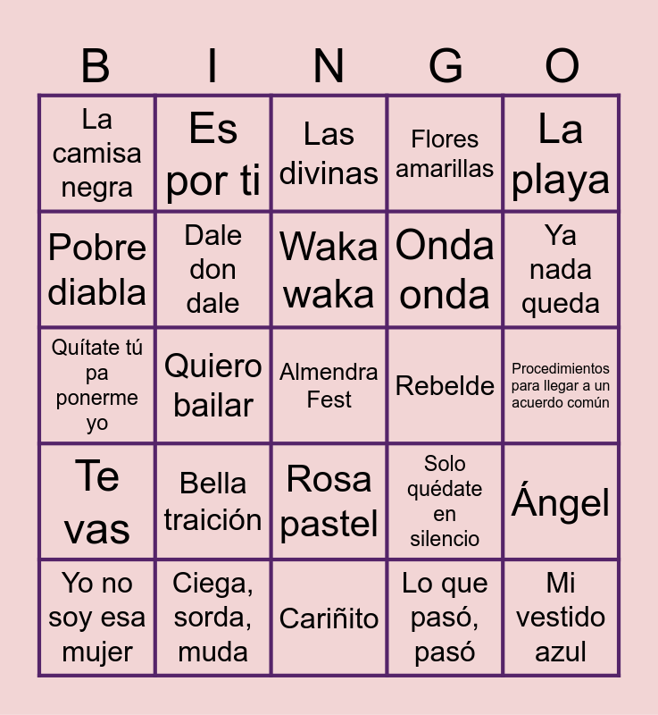 This bingo card has a free space and 30 words: Ciega, sorda, muda, Narcisista por excelencia, Quiero bailar, Perfecta, La camisa negra, Las divinas, Dale don dale, Rosa pastel, Rebelde, Cariñito, Procedimientos para llegar a un acuerdo común, Mi vestido azul, Lo que pasó, pasó, Sugar, Ya nada queda, Beso en la boca, Solo quédate en silencio, Te vas, Bella traición, La playa, Quítate tú pa ponerme yo, Sin despertar, Es por ti, Onda onda, Pobre diabla, Flores amarillas, Ángel, Yo no soy esa mujer, Waka waka and Gasolina.