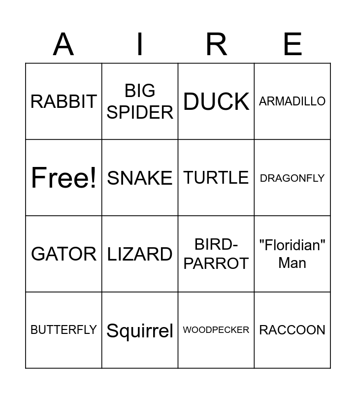 This bingo card has 16 words: Squirrel, "Floridian" Man, DUCK, RABBIT, GATOR, BIG SPIDER, BIRD-PARROT, WOODPECKER, Free!, SNAKE, BUTTERFLY, ARMADILLO, LIZARD, DRAGONFLY, TURTLE and RACCOON.