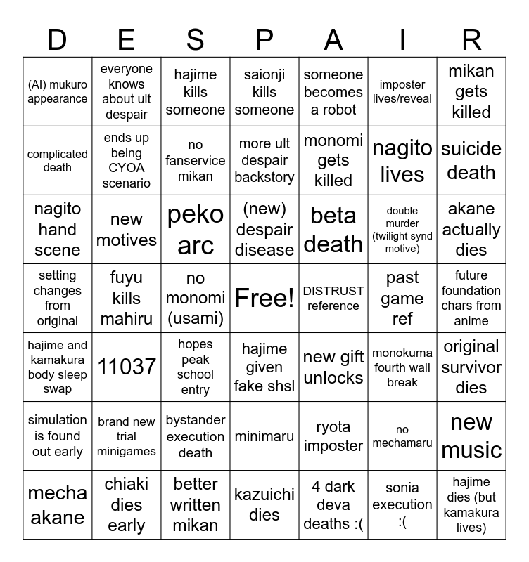 This bingo card has a free space and 48 words: ryota imposter, nagito lives, kazuichi dies, fuyu kills mahiru, peko arc, future foundation chars from anime, everyone knows about ult despair, chiaki dies early, imposter lives/reveal, hajime given fake shsl, mikan gets killed, saionji kills someone, double murder (twilight synd motive), beta death, simulation is found out early, past game ref, complicated death, suicide death, no mechamaru, someone becomes a robot, monomi gets killed, no monomi (usami), (AI) mukuro appearance, ends up being CYOA scenario, new music, no fanservice mikan, akane actually dies, mecha akane, (new) despair disease, new motives, sonia execution :(, DISTRUST reference, original survivor dies, brand new trial minigames, setting changes from original, new gift unlocks, monokuma fourth wall break, nagito hand scene, hopes peak school entry, bystander execution death, hajime and kamakura body sleep swap, hajime dies (but kamakura lives), hajime kills someone, better written mikan, more ult despair backstory, minimaru, 11037 and 4 dark deva deaths :(.