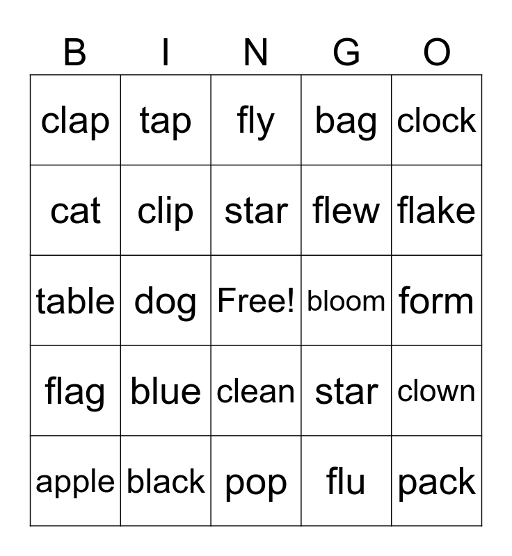 This bingo card has a free space and 24 words: apple, blue, star, flu, clock, clap, tap, fly, bloom, form, table, clip, star, clown, cat, black, pop, bag, flake, flag, dog, clean, flew and pack.