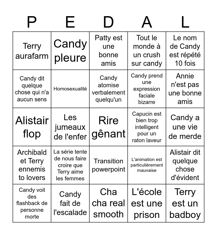 This bingo card has a free space and 24 words: La série tente de nous faire croire que Terry aime les femmes, Candy fait de l'escalade, Candy atomise verbalement quelqu'un, Candy voit des flashback de personne morte, Le nom de Candy est répété 10 fois, Terry aurafarm, Candy dit quelque chose qui n'a aucun sens, Candy pleure, Capucin est bien trop intelligent pour un raton laveur, Transition powerpoint, Candy prend une expression faciale bizarre, Alistair flop, L'animation est particulièrement mauvaise, Alistair dit quelque chose d'évident, Homosexualité, L'école est une prison, Candy a une vie de merde, Patty est une bonne amis, Annie n'est pas une bonne amis, Les jumeaux de l'enfer, Terry est un badboy, Archibald et Terry ennemis to lovers, Tout le monde à un crush sur candy and Cha cha real smooth.