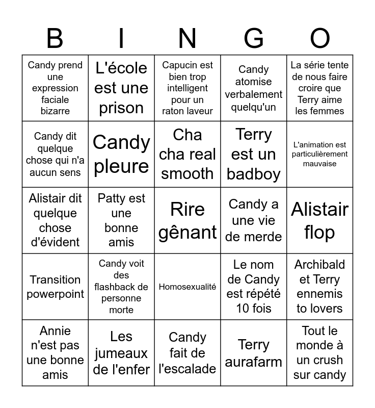 This bingo card has a free space and 24 words: Candy voit des flashback de personne morte, Les jumeaux de l'enfer, Cha cha real smooth, Annie n'est pas une bonne amis, La série tente de nous faire croire que Terry aime les femmes, Candy prend une expression faciale bizarre, Candy dit quelque chose qui n'a aucun sens, L'école est une prison, Candy a une vie de merde, Homosexualité, Terry est un badboy, Alistair dit quelque chose d'évident, Le nom de Candy est répété 10 fois, Archibald et Terry ennemis to lovers, Candy pleure, Terry aurafarm, Alistair flop, Capucin est bien trop intelligent pour un raton laveur, L'animation est particulièrement mauvaise, Patty est une bonne amis, Tout le monde à un crush sur candy, Transition powerpoint, Candy atomise verbalement quelqu'un and Candy fait de l'escalade.