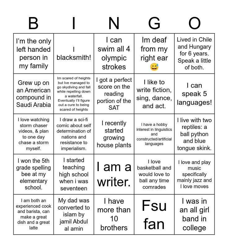 This bingo card has 27 words: I love basketball and would love to ball any time comrades, I was in an all girl band in college, I like to write fiction, sing, dance, and act., I have more than 10 brothers, Grew up on an American compound in Saudi Arabia, I can swim all 4 olympic strokes, I blacksmith!, I won the 5th grade spelling bee at my elementary school., I have a hobby interest in linguistics and constructed/artificial languages, I love and play music specifically mainly jazz and I love moves, I love watching storm chaser videos, & plan to one day chase a storm myself., Im deaf from my right ear 😅, I am both an experienced cook and barista, can make a great dish and a great latte, My dad was converted to islam by jamil Abdul al amin, I can speak 5 languages!, I run to anime music videos, Im scared of heights but Ive managed to go skydiving and fall while repelling down a waterfall. Eventually I’ll figure out a cure to being scared of heights, I got a perfect score on the reading portion of the SAT, I started teaching high school when i was seventeen, I’m the only left handed person in my family, I live with two reptiles: a ball python and blue tongue skink., Fsu fan, I draw a sci-fi comic about self determination of nations and resistance to imperialism., I recently started growing house plants, I am a writer., Lived in Chile and Hungary for 6 years. Speak a little of both. and I’m a singer.