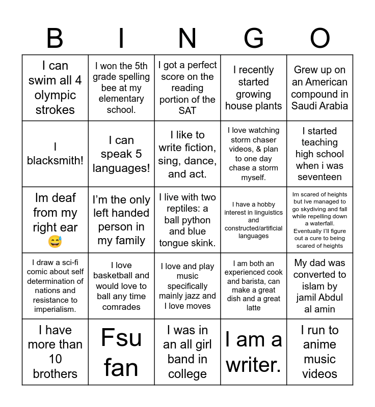 This bingo card has 25 words: I love basketball and would love to ball any time comrades, I was in an all girl band in college, I like to write fiction, sing, dance, and act., I have more than 10 brothers, Grew up on an American compound in Saudi Arabia, I can swim all 4 olympic strokes, I blacksmith!, I won the 5th grade spelling bee at my elementary school., I have a hobby interest in linguistics and constructed/artificial languages, I love and play music specifically mainly jazz and I love moves, I love watching storm chaser videos, & plan to one day chase a storm myself., Im deaf from my right ear 😅, I am both an experienced cook and barista, can make a great dish and a great latte, My dad was converted to islam by jamil Abdul al amin, I can speak 5 languages!, I run to anime music videos, Im scared of heights but Ive managed to go skydiving and fall while repelling down a waterfall. Eventually I’ll figure out a cure to being scared of heights, I got a perfect score on the reading portion of the SAT, I started teaching high school when i was seventeen, I’m the only left handed person in my family, I live with two reptiles: a ball python and blue tongue skink., Fsu fan, I draw a sci-fi comic about self determination of nations and resistance to imperialism., I recently started growing house plants and I am a writer..