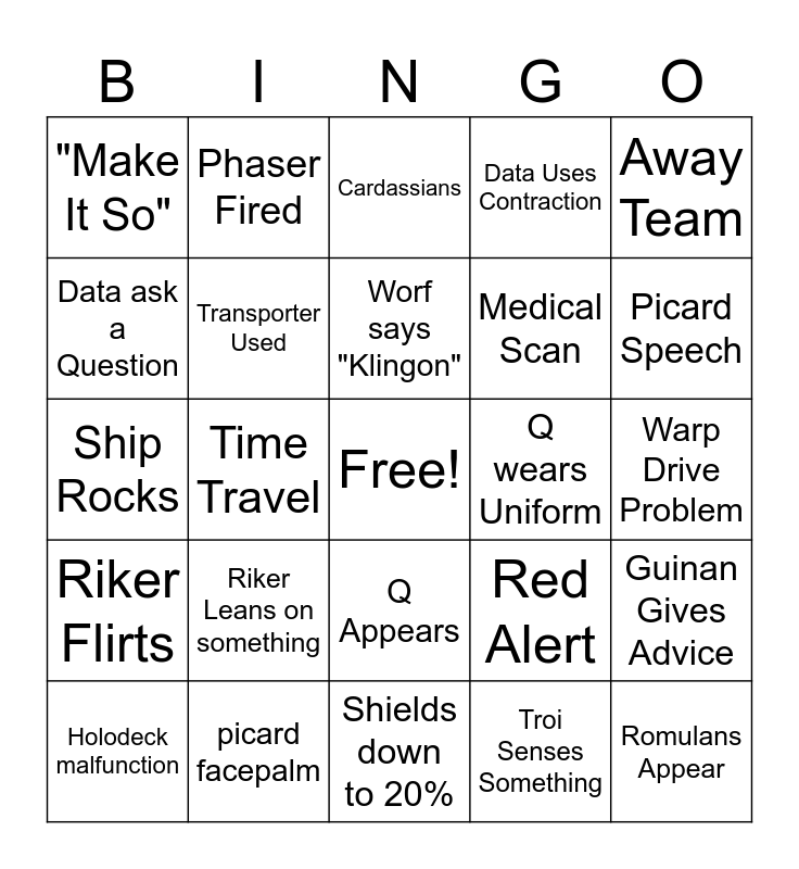This bingo card has a free space and 24 words: Riker Leans on something, picard facepalm, Worf says "Klingon", Holodeck malfunction, Away Team, "Make It So", Data ask a Question, Phaser Fired, Q wears Uniform, Q Appears, Medical Scan, Ship Rocks, Red Alert, Guinan Gives Advice, Transporter Used, Troi Senses Something, Warp Drive Problem, Cardassians, Picard Speech, Time Travel, Romulans Appear, Riker Flirts, Data Uses Contraction and Shields down to 20%.