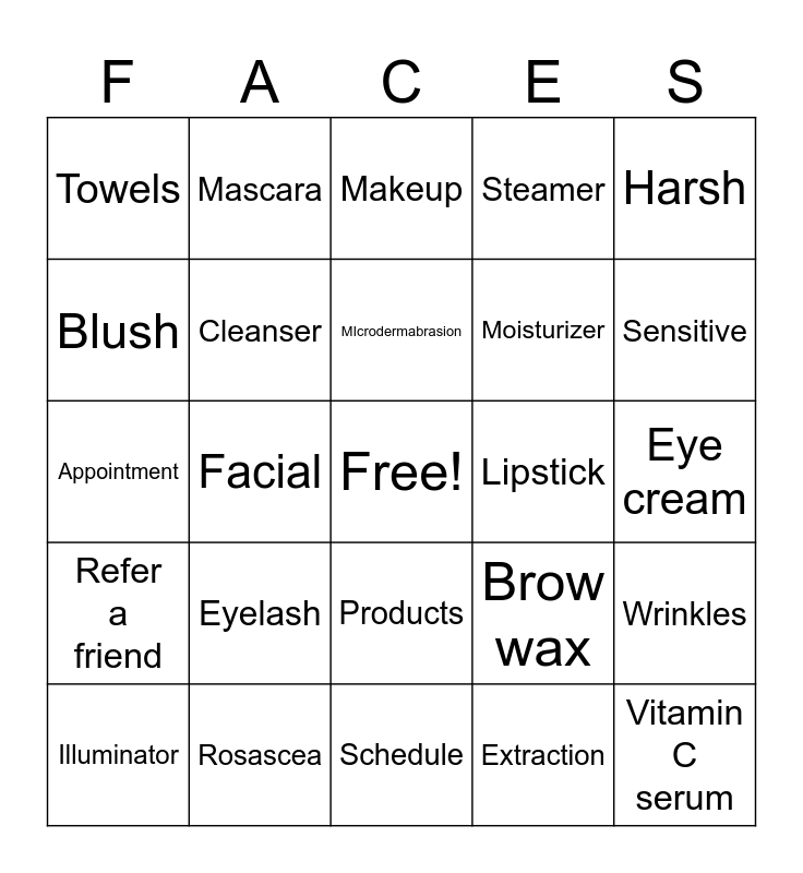 This bingo card has a free space and 24 words: Eyelash, Rosascea, MIcrodermabrasion, Illuminator, Harsh, Towels, Blush, Mascara, Lipstick, Products, Moisturizer, Appointment, Brow wax, Wrinkles, Cleanser, Extraction, Eye cream, Makeup, Sensitive, Facial, Vitamin C serum, Refer a friend, Steamer and Schedule.
