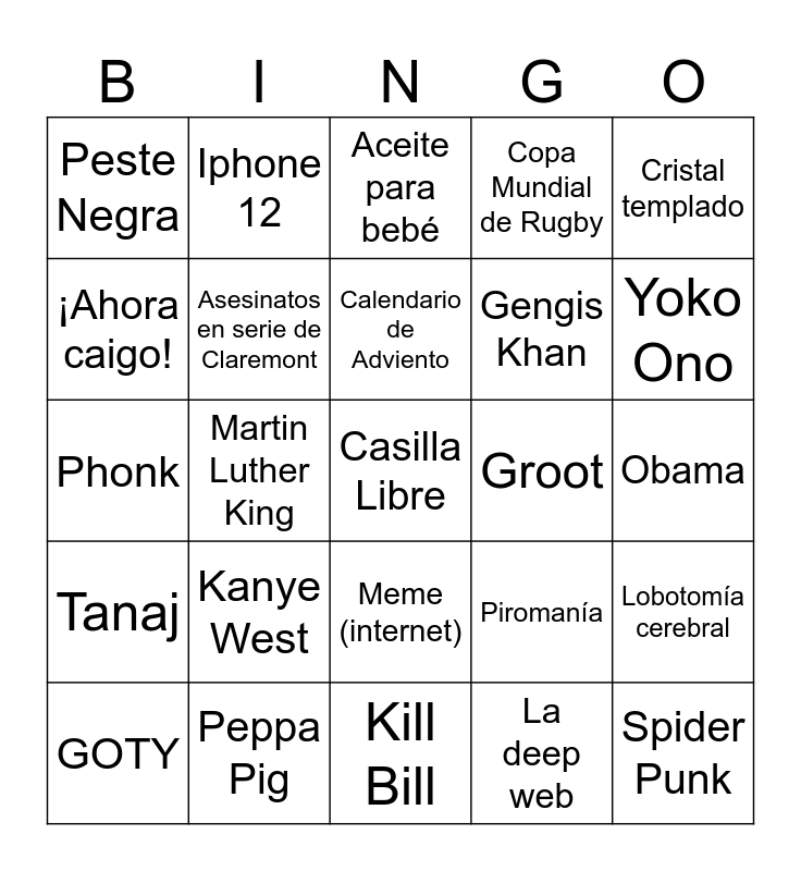 This bingo card has a free space and 24 words: Kanye West, Peppa Pig, Calendario de Adviento, GOTY, Cristal templado, Peste Negra, ¡Ahora caigo!, Iphone 12, Groot, Meme (internet), Gengis Khan, Phonk, Piromanía, Lobotomía cerebral, Asesinatos en serie de Claremont, La deep web, Obama, Aceite para bebé, Yoko Ono, Martin Luther King, Spider Punk, Tanaj, Copa Mundial de Rugby and Kill Bill.