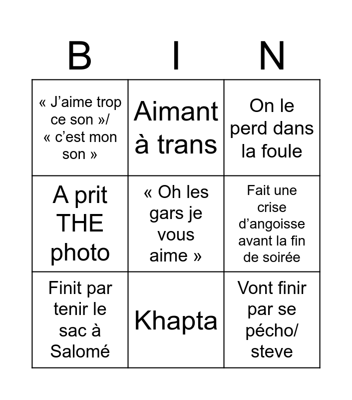 This bingo card has a free space and 8 words: Fait une crise d’angoisse avant la fin de soirée, On le perd dans la foule, Aimant à trans, Finit par tenir le sac à Salomé, « J’aime trop ce son »/ « c’est mon son », Vont finir par se pécho/ steve, A prit THE photo and Khapta.