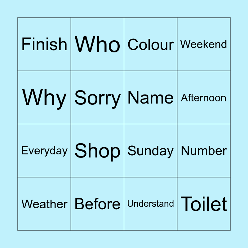 This bingo card has 20 words: Number, Morning, Colour, What, Weather, Why, Before, Finish, Everyday, Who, Shop, Sunday, Sorry, Toilet, Name, Which, Afternoon, Weekend, Understand and Repeat.
