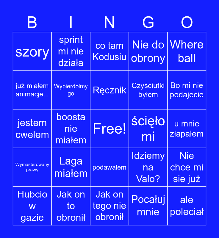 This bingo card has a free space and 24 words: Hubcio w gazie, Laga miałem, Ręcznik, Pocałuj mnie, Where ball, szory, sprint mi nie działa, co tam Kodusiu, ścięło mi, u mnie złapałem, jestem cwelem, Wypierdolmy go, Idziemy na Valo?, Nie chce mi sie już, już miałem animacje..., Jak on to obronił, Jak on tego nie obronił, Nie do obrony, Bo mi nie podajecie, Wymasterowany prawy, boosta nie miałem, podawałem, Czyściutki byłem and ale poleciał.