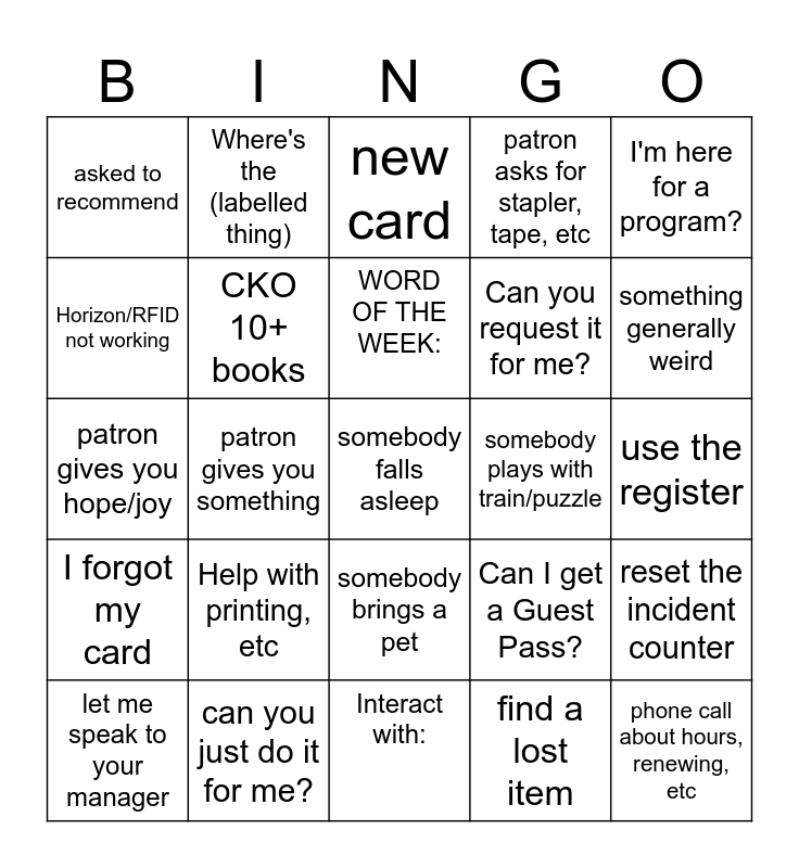 This bingo card has 25 words: Help with printing, etc, Interact with:, WORD OF THE WEEK:, let me speak to your manager, I'm here for a program?, asked to recommend, Horizon/RFID not working, Where's the (labelled thing), somebody plays with train/puzzle, somebody brings a pet, Can you request it for me?, patron gives you hope/joy, Can I get a Guest Pass?, reset the incident counter, CKO 10+ books, phone call about hours, renewing, etc, use the register, new card, something generally weird, patron gives you something, somebody falls asleep, can you just do it for me?, I forgot my card, patron asks for stapler, tape, etc and find a lost item.