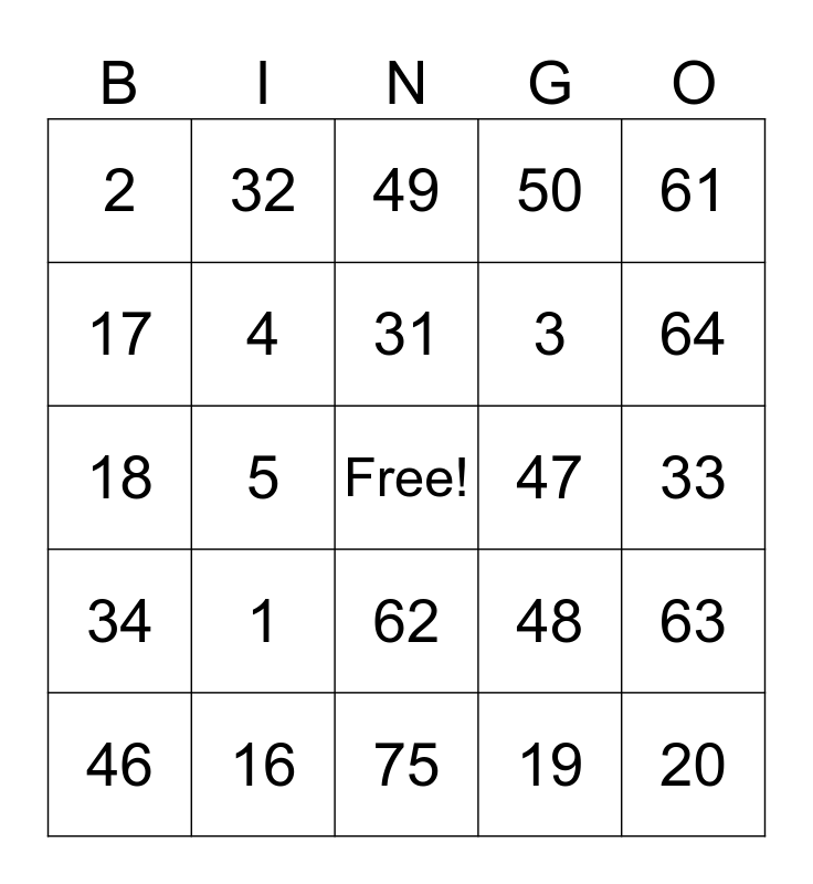 This bingo card has a free space and 24 words: 1, 16, 31, 46, 61, 2, 17, 32, 47, 62, 3, 18, 48, 63, 4, 19, 33, 49, 64, 5, 20, 34, 50 and 75.