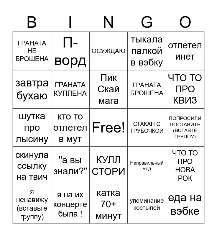 This bingo card has a free space and 24 words: "а вы знали?", я на их концерте была !, Пик Скай мага, я ненавижу (вставьте группу), отлетел инет, ГРАНАТА НЕ БРОШЕНА, завтра бухаю, П-ворд, СТАКАН С ТРУБОЧКОЙ, КУЛЛ СТОРИ, ГРАНАТА БРОШЕНА, шутка про лысину, Неправильный мед, ЧТО ТО ПРО НОВА РОК, ГРАНАТА КУПЛЕНА, упоминание костылей, ПОПРОСИЛИ ПОСТАВИТЬ (ВСТАВТЕ ГРУППУ), ОСУЖДАЮ, ЧТО ТО ПРО КВИЗ, кто то отлетел в мут, еда на вэбке, скинула ссылку на твич, тыкала палкой в вэбку and катка 70+ минут.