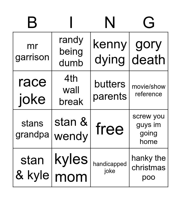 This bingo card has 16 words: kyles mom, screw you guys im going home, kenny dying, mr garrison, stans grandpa, randy being dumb, free, handicapped joke, race joke, 4th wall break, stan & kyle, gory death, stan & wendy, movie/show reference, butters parents and hanky the christmas poo.