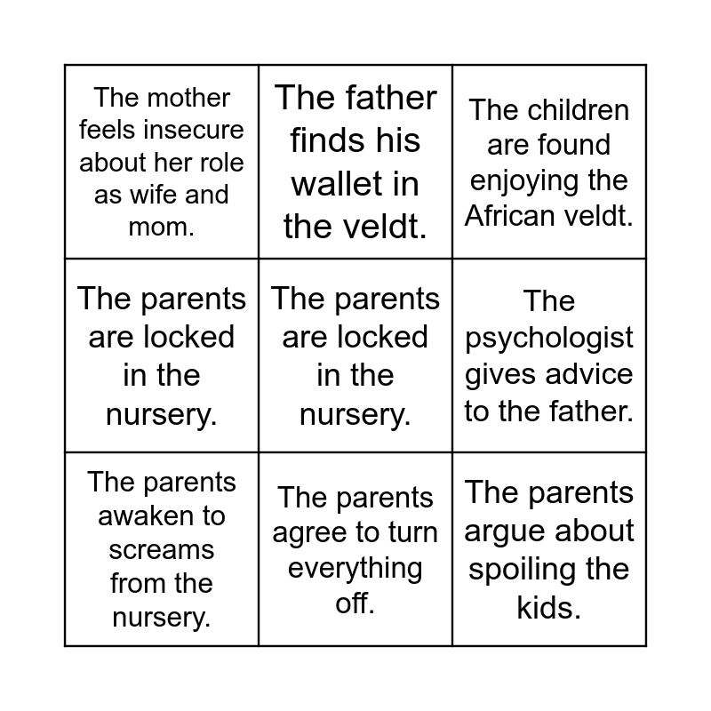 This bingo card has 11 words: The parents argue about spoiling the kids., The parents agree to turn everything off., The parents are locked in the nursery., The parents awaken to screams from the nursery., The father finds his wallet in the veldt., The children are found enjoying the African veldt., The psychologist gives advice to the father., The parents agree to taking a vacation., The parents are locked in the nursery., The mother feels insecure about her role as wife and mom. and The parents argue about spoiling the kids..