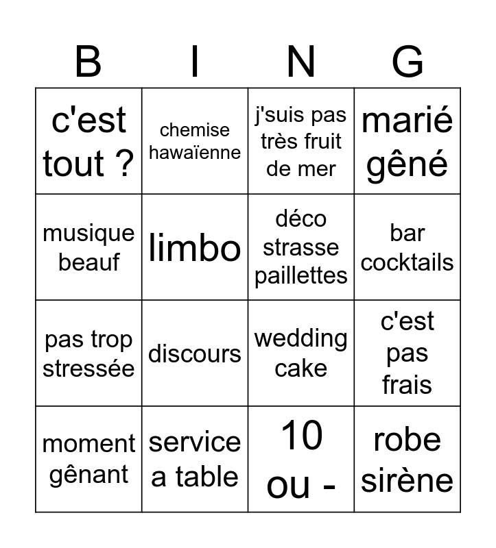 This bingo card has 16 words: service a table, c'est pas frais, j'suis pas très fruit de mer, c'est tout ?, pas trop stressée, chemise hawaïenne, wedding cake, 10 ou -, musique beauf, limbo, moment gênant, marié gêné, discours, bar cocktails, déco strasse paillettes and robe sirène.