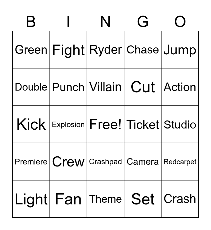 This bingo card has a free space and 75 words: Colt, Jody, Ryder, Gail, Winston, Tucker, Stuntman, Director, Producer, Cameraman, Actor, Hero, Villain, Double, Seavers, Explosion, Fire, Crash, Dive, Jump, Fall, Kick, Punch, Fight, Chase, Car, Truck, Helicopter, Boat, Rope, Rig, Harness, Pyro, Camera, Action, Cut, Scene, Script, Studio, Set, Spotlight, Makeup, Costume, Cowboy, Hat, Sunset, Light, Green, Screen, Behind, Boom, Crashpad, Fireball, Flip, Wreck, Break, Bone, Risk, Fame, Star, Crew, Reel, Blockbuster, Popcorn, Seat, Ticket, Credit, Oscar, Award, Redcarpet, Premiere, Fan, Shoutout, Theme and Stunt.
