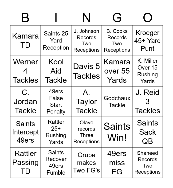 This bingo card has 25 words: Rattler 25+ Rushing Yards, Grupe makes Two FG's, Davis 5 Tackles, Rattler Passing TD, Kroeger 45+ Yard Punt, Kamara TD, Werner 4 Tackles, Saints 25 Yard Reception, Godchaux Tackle, Olave records Three Receptions, Kamara over 55 Yards, C. Jordan Tackle, Saints Win!, Saints Sack QB, Kool Aid Tackle, Shaheed Records Two Receptions, J. Reid 3 Tackles, J. Johnson Records Two Receptions, K. Miller Over 15 Rushing Yards, 49ers False Start Penalty, A. Taylor Tackle, Saints Recover 49ers Fumble, Saints Intercept 49ers, B. Cooks Records Two Receptions and 49ers miss FG.